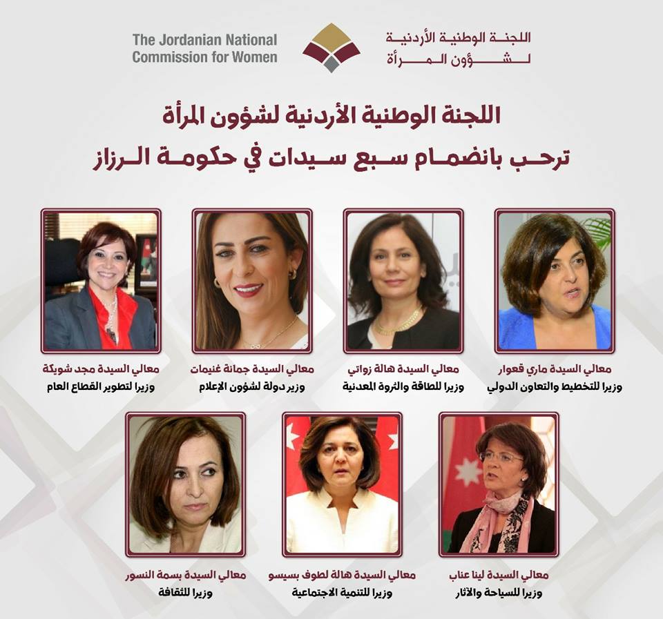 ترحب اللجنة الوطنية الأردنية لشؤون المرأة بانضمام سبعة سيدات للفريق الوزاري المشكل برئاسة دولة الدكتور عمر الرزاز، وهي حكومة يعول عليها الكثير لتحقيق الطموحات التي دفعت بأبناء وبنات الأردن للخروج إلى الشارع للمطالبة بالتغيير والاصلاح، وتأمل اللجنة أن تكون مرجعية الفريق الوزاري مبادئ حقوق الانسان والمساواة بين الجنسين وتحقيق العدالة الاجتماعية وسيادة القانون،وأن تنتهج الحكومة نهجا سياسيا واقتصاديا واجتماعيا، جوهره تحقيق النمو والعدالة وتكافؤ الفرص من خلال البحث عن حلول خلاقة وبرنامج عمل نحو بناء مجتمع منتج يوفر سبل العيش بكرامة ويمكن أفراد المجتمع بكافة فئاته من الوسائل والفرص للمساهمة في الارتقاء بالأردن في مسيرته نحو دولة ديموقراطية يكون الشعب فيها مصدرا للسلطات ومشاركا في صناعة القرار وبناء وتحقيق رؤية المستقبل.