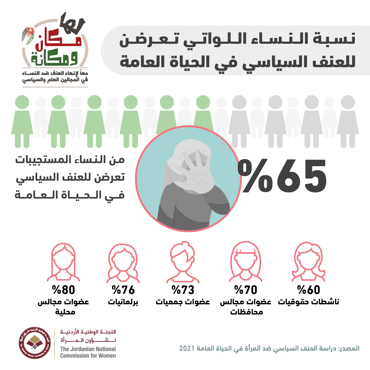 وفيما يتعلق بالعنف ضمن المؤسسات السياسية افادت الدراسة أن المرأة لا تتمتع بنفس مكانة الرجل، وفي العديد من الأحيان يتم اشراك المرأة لزيادة الأصوات أو لاستغلال خلفيتها العشائرية، وهناك اشكال اخرى للعنف تعززه التقاليد والعادات الاجتماعية، والصورة النمطية القائمة لدور المرأة، وثقافة التنمر بالرغم من الجهود التي يبذلها الأردن في الانصاف والعدالة وتمكين المرأة اقتصاديًا وزيادة نسبة تعليم الإناث في الأردن.